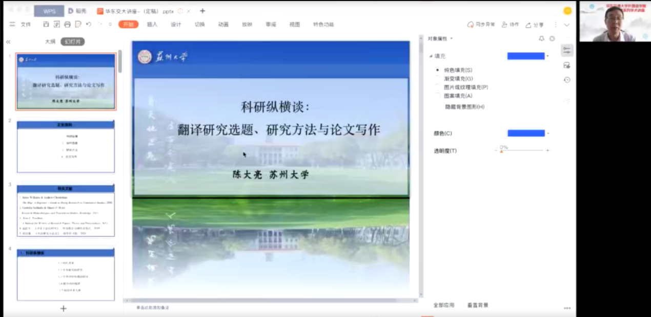 师生带来了一场题为《科研纵横谈:翻译研究的选题、方法与写作》的学术讲座。本次讲座线上进行,由彩票