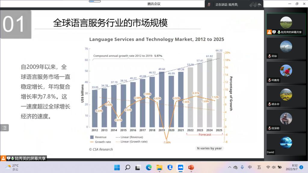 闫栗丽老师首先对国内外语言服务行业的发展进行回顾与展望,对比了前四次翻译浪潮,阐述了第五次翻译浪潮的特点,并总结了目前语言服务发展的几大趋势。她指出语言能力是国家软实力,语言战略是国家的顶层战略,语言赋能国际传播,并分析在新媒体、新技术背景下,“外语+”结合人工智能与大数据、国际传播、区域国别研究等新方向和新技能的必要。最后,闫栗丽老师还分析了疫情给语言服务行业带来的影响,并对外语专业学生的职业规划提出了建议。