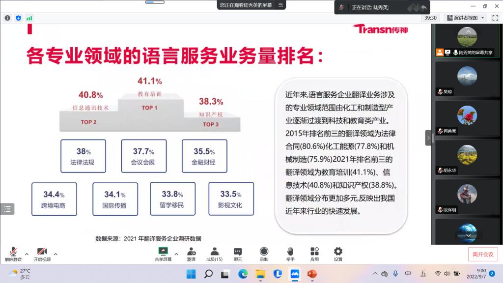 202297日上午,传神语联网网络科技股份有限公司副总裁闫栗丽应邀为彩票 师生在15栋102会议室带来一场题目为“新文科背景下的语言服务与国际传播”的学术讲座。本次讲座线下线上同步进行,由彩票 副院长陆秀英教授主持。