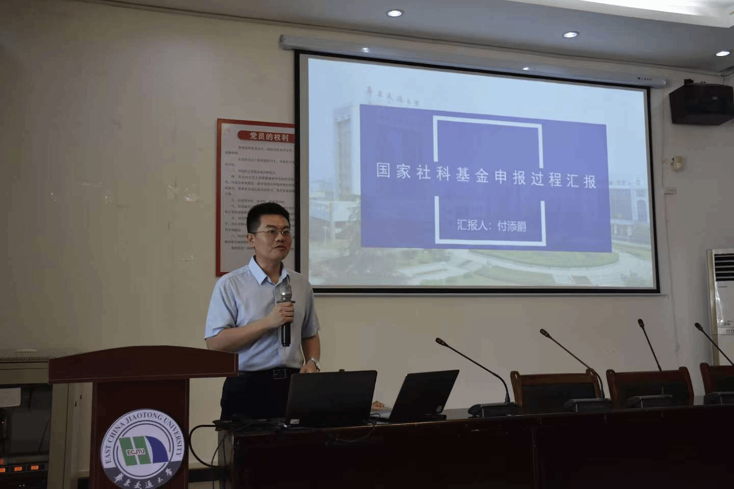 第一阶段由高老师团队就国家社科基金申报选题与论证策略为大家进行了详细解读,并分析了存在的问题。第二阶段由付添爵博士讲解,讲座主要围绕社科基金的申报历史、内容撰写、格式技巧等方面进行。付博士指出,国家社科要兼顾国家需求和个人学术专长,要踏踏实实做好学术积累。在提问互动环节,针对AI使用与学科跨界问题,建议谨慎筛选AI生成内容,把握跨界“窗口期”。最后,陆秀英院长总结会议,高度肯定高老师团队和付博士分享的真诚与价值,鼓励教师借鉴经验推进申报工作。
