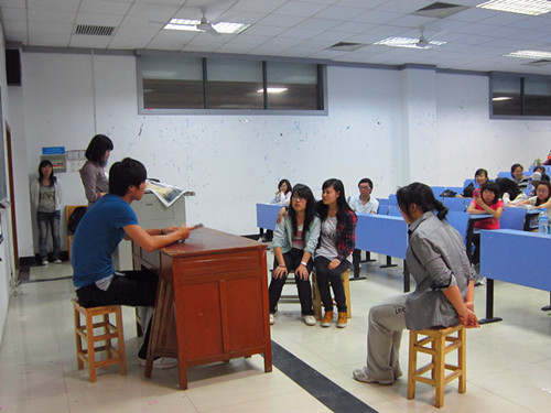 肖家玮潘政报道)5月5日晚上7点,一年一度的彩票 的英语剧大赛初赛在北区15栋118和116同时上演,来自外语学院10、11级共12个参赛班级在初赛中展现了各自的创作才华和表演才能,(大话西游)》笑料百出,high级英语4(不管明天变成如何)》表现了世界末日来临之际人性的觉醒,启迪我们要珍视眼前所有。