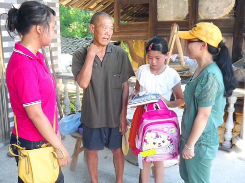 在走访的几个贫困生家庭中,大多数孩子自幼不幸失去单亲,和爷爷奶奶甚至姑姑一起过着拮据的生活。队员们在走访中不但为她们送上书包、笔盒、笔记本等学习用品,还送去了一份问候,鼓励着孩子们积极乐观地面对生活、面对困难,努力学习,今后考上大学,来回报辛苦养育自己的亲人。