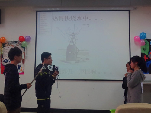 此次主题为“生命爱阳光,幸福需安全”的安全大赛有来自机电、外院、信息的共计十五支队伍参与。比赛在三院共同拍摄的一段强调“维护你我校园,共创美好未来”安全宣讲视频后正式开始。外院的第一支队伍由英语3、4班组成,他们首先为在座的观众带来了一段相声——《打劫》。其诙谐的语言,搞笑的台词,不仅让观众爆发出阵阵笑声,也让大家从中获得安全知识,从而获得了评委的一致好评。接下来外院两支代表队带来的《西游之安全篇》、《如此辩论》也以其创新独到的角度活跃了赛场气氛,给观众留下了深刻印象。当所有表演告一段落时,表演嘉宾带来了一曲《爱的华尔兹》,为本次比赛添上了一笔浓墨重彩。