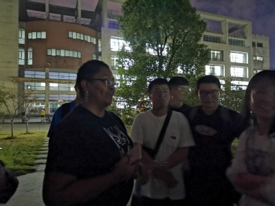 18翻译二班主办的英语角活动在外院小广场顺利举行。Amine、LaQuete、Drew三位外教应邀参加。