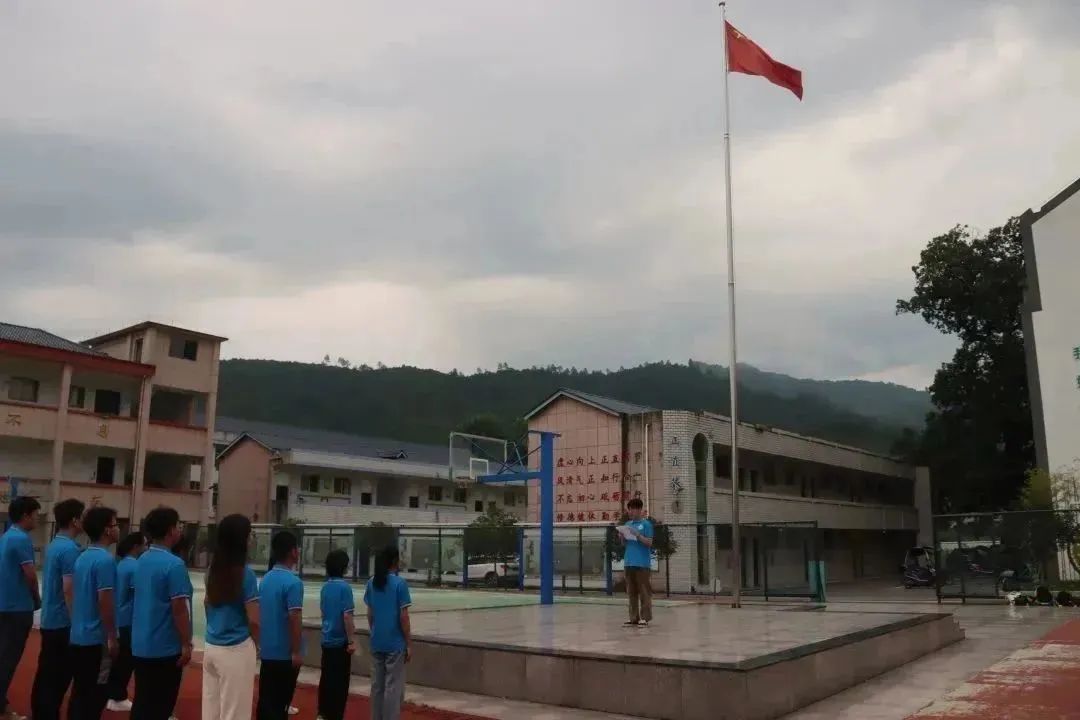 电气-外语学院“火车头”暑期实践队在操场开始晨练,迎接新的一天到来。随后,党员代表任绍博进行国旗下讲话——《弘扬社会主义核心价值观,我们在行动》。