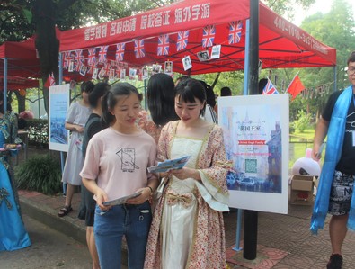 本届“红五月”英语文化艺术节以“中西文化交流”为主题,英文戏剧、英文小说、英文电影、英国王室和中国新疆、西藏、云南等省文化代表……从英语国家文化到大美中国风采,每个班级的展区都充满着文化气息,等待着同学们去感受。在一个“英式风情”的摊点上,精致的“英式”下午茶吸引了大批路人的驻足品尝,17英语(国贸)班通过独具特色的方式展示其主题“英国皇室”的魅力;17英语(国金)二班则用英文”快问快答“的方式,凸显彩票