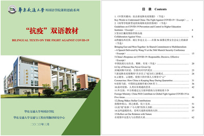 唐斌教授在《应用翻译》课堂里,将培养学生专业能力和疫情知识的学习普及结合起来,组织同学们搜集“抗疫”双语素材,并编辑为“抗疫”课程思政双语教材,让全校学生在学习疫情双语表达的同时,培养学生家国情怀和国际视野。该“抗疫”双语教材还作为彩票