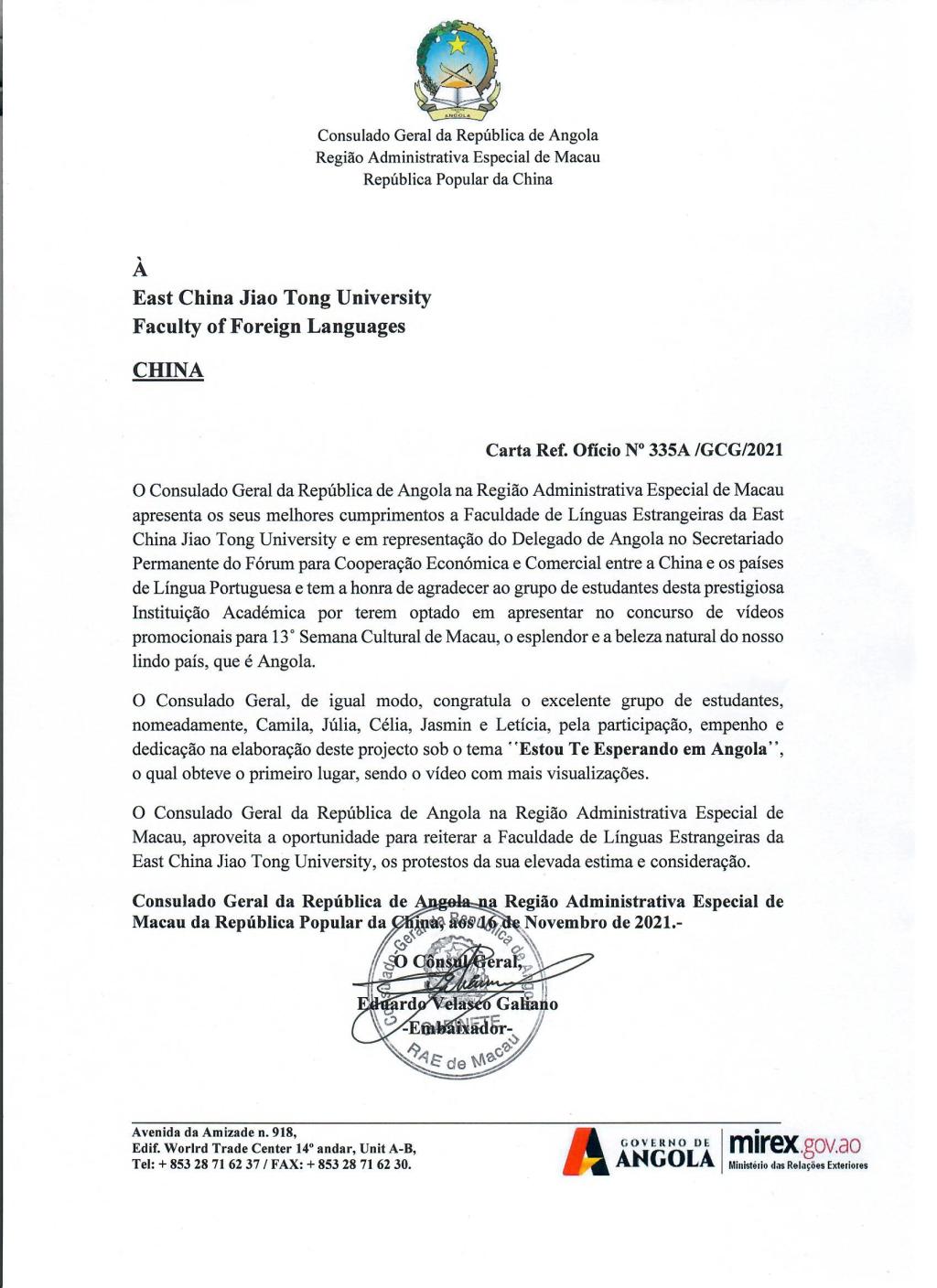 赛后,安哥拉驻澳门特别行政区总领事向我校发函,感谢我校学生向世界展示安哥拉的壮美,同时向获奖团队致以诚挚祝贺,向彩票