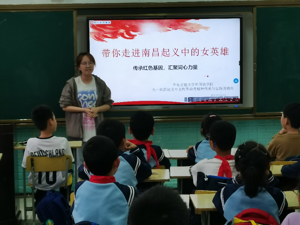 课堂伊始,课题组的讲解人员——外语学院曾粤睿同学向三(1)班的学生们展现了三张八一纪念馆的图片,并介绍了南昌起义的领导人。随后,曾粤瑞绘声绘色地介绍了杨庆兰、谭勤先与陈觉吾三个南昌起义女英雄的故事。在总结女英雄精神时,学生们踊跃举手,说出了他们心目中女英雄的精神。