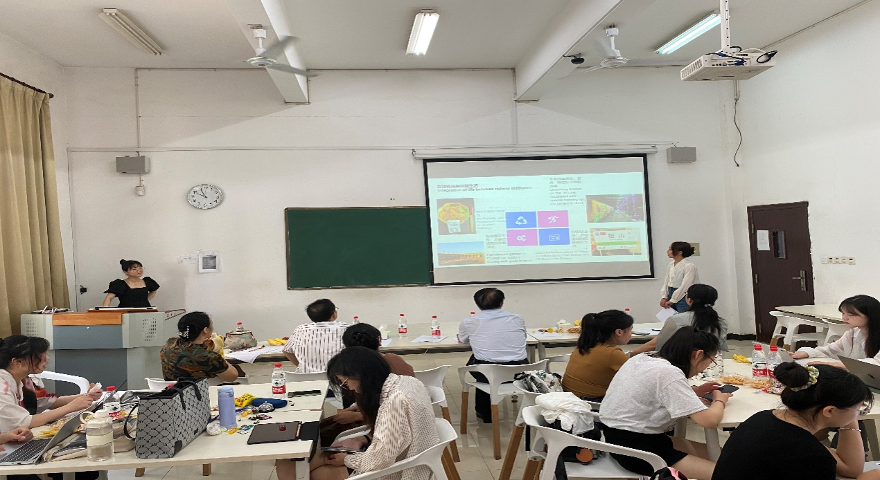 第一场为中外铁路文化分享交流会,各小组就中国铁路精神、印度铁路车站文化、跨海环岛铁路、哈大高铁等进行展示,各位老师也对同学们的展示进行了点评,肯定同学们准备充分、资料详实的同时也指出了相关不足之处,并给出了很多建设性意见。中场休息环节时开展了中外铁路文化知识竞赛,各小组争先恐后,纷纷抢答,现场气氛热烈。