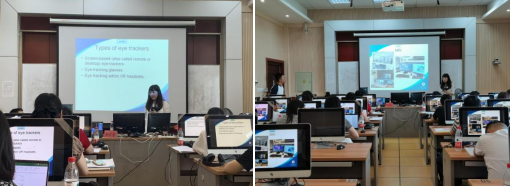 12日下午,澳门大学人文学院助理院长,硕士、博士生导师,认知与脑科学研究中心研究员李丽青教授重点传授如何使用眼动仪设备进行实践操作以及如何分析和讨论实验结果。期间,李教授热情邀请两位学员参与口译及笔译眼动实验,并使用两次实验所得数据进行数据采集与研究,生动翔实地为大家展示了眼动实验研究。