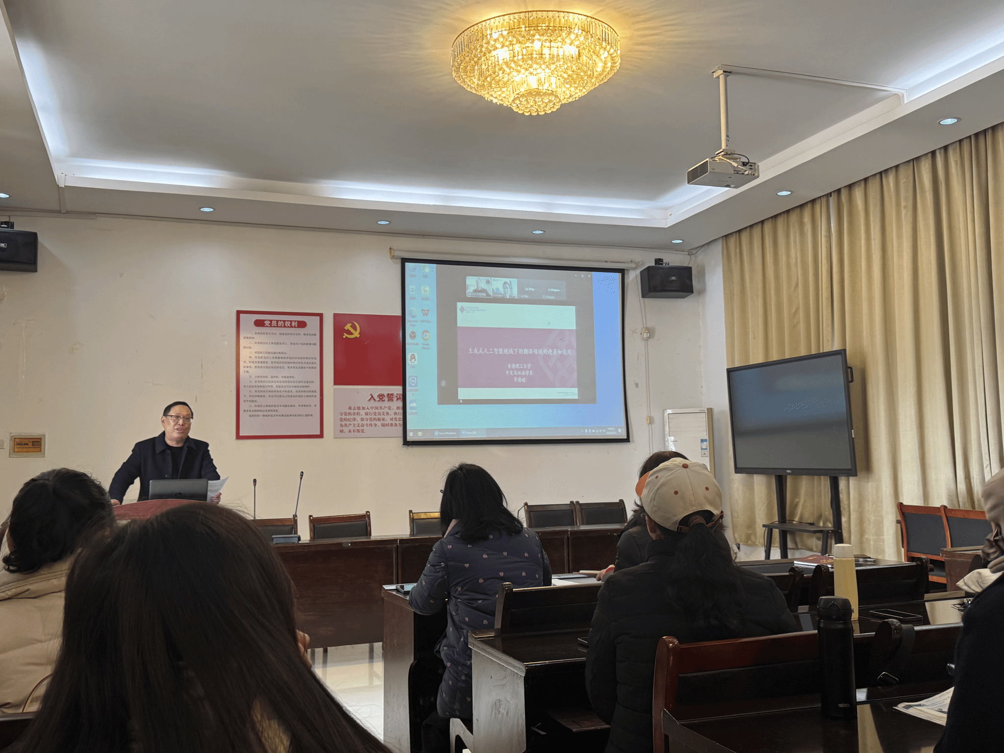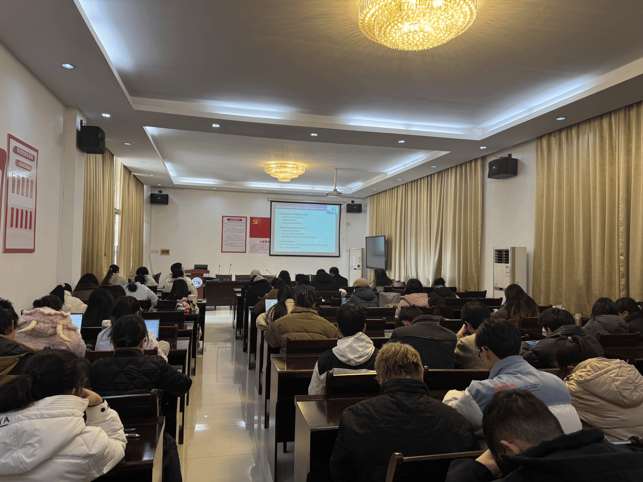 全体教师、2023级翻译硕士学生及翻译专业本科生在15-102会议室参加讲座。