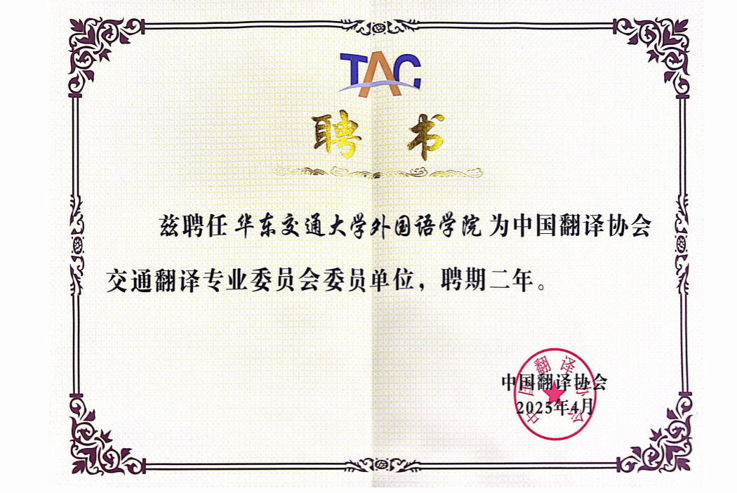 当选为中国翻译协会交通翻译专业委员会委员单位,彭莉老师受聘为中国翻译协会交通翻译专业委员会委员。