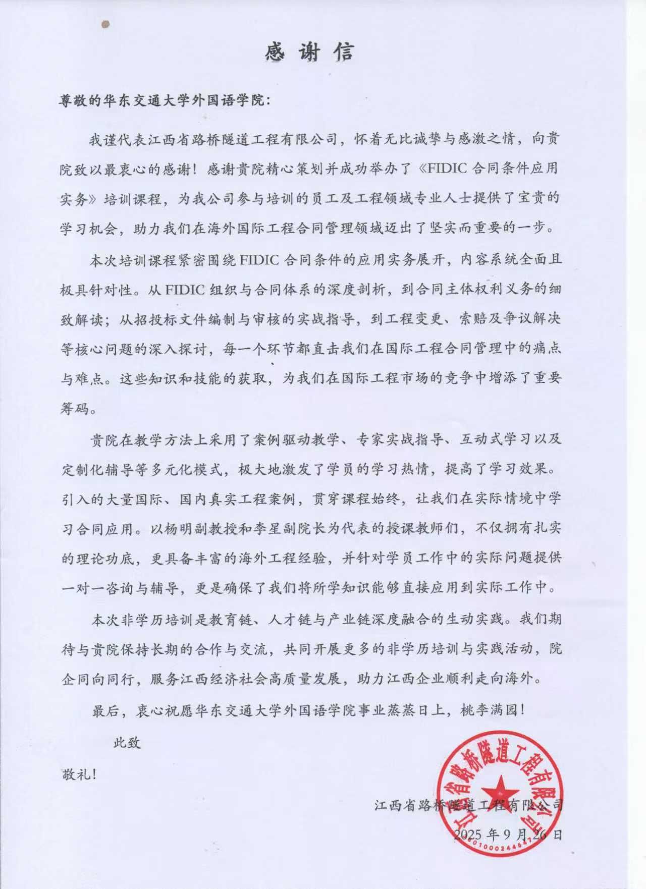 本次培训获得江西省路桥隧道工程有限公司的一致认可,江西省路桥隧道工程有限公司特发来感谢信。
