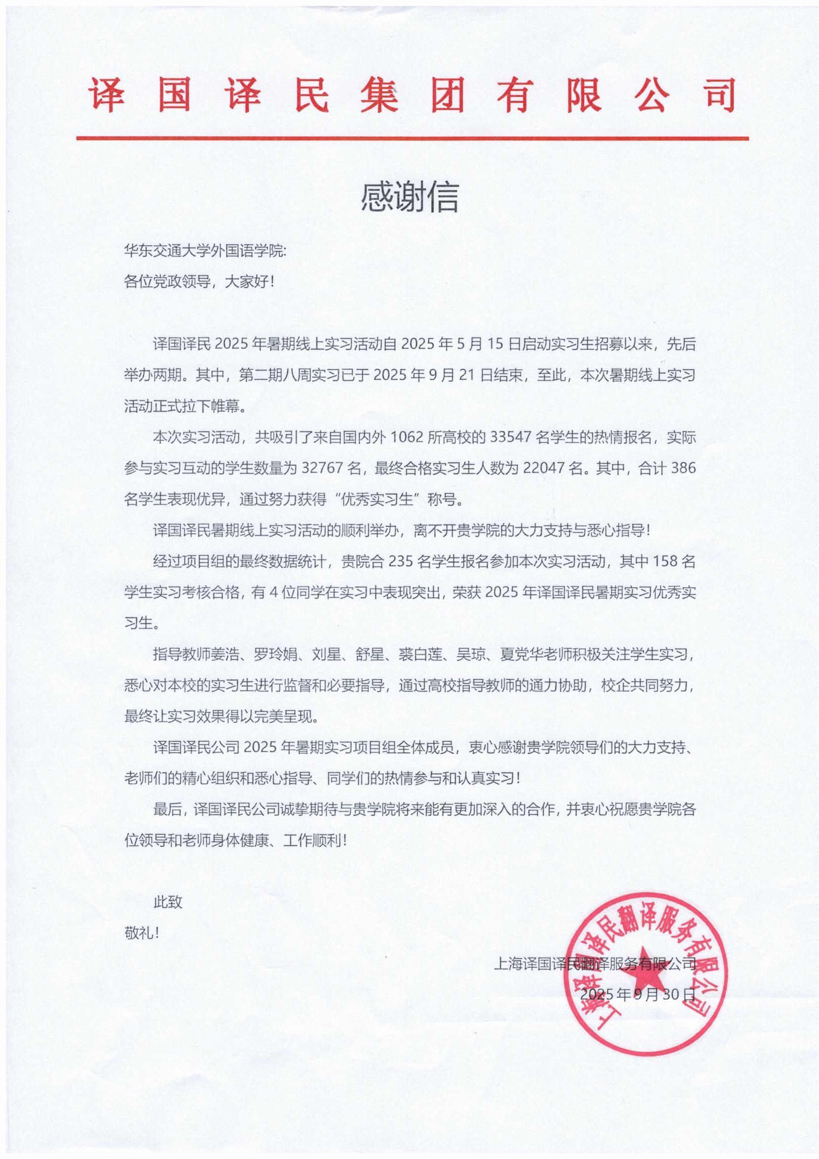 联合上海译国译民翻译服务有限公司,成功举办了“2025暑期公益线上外语实习实践”。该项目为学生提供了接触前沿翻译技术与行业实践的宝贵机会,旨在帮助学生准确认识AI技术的工具属性,掌握智能时代语言服务新技能,深化对现代语言行业的认知,有效弥合在校学习与行业实践间的差距。